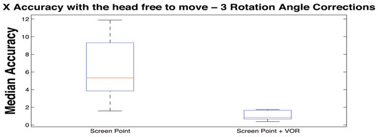 X accuracy with the head free to move, corrections are reported for three rotation angles.