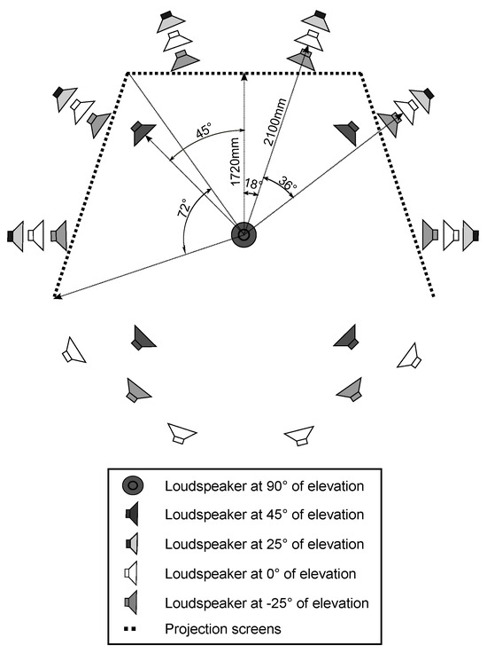 The test was conducted in an immersive audiovisual environment, which consisted of three HD video projectors and 29 loudspeakers (Genelec 1029). A schematic of the system is depicted in Figure 1. The loudspeakers were installed in a spherical formation at five elevation levels around the observation position. The loudspeaker grid was made more dense behind the projection screen. The image was projected on three nearly acoustically transparent screens, 2.5 × 1.88 m each, following the shape of the base of a pentagon.