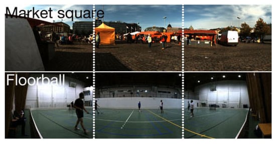 Figure 2 presents a screen capture of the two scenes used as stimuli in this study. The upper panel shows the scene called Market square, where a view of a busy market square is shown. The soundscape consists of people chatting and noises of distant traffic. The second scene, shown in the lower panel, displays a game of floorball. In this scene the soundscape consists of the players’ footsteps and shouts, and the sounds of the ball and sticks hitting the floor. The main difference between the scenes is that in the market square there is no single audiovisual event that would capture the attention, whereas in the game of floorball there is a stream of transient audiovisual events creating a storyline of the game. Van der Burg, Cass, Olivers, Theeuwes, and Alais (2010) have shown that abrupt audiovisual events are needed in order to gain benefits in visual search tasks. Moreover, the audiovisual display must not be cluttered with visual distractor events during the temporal binding window in order to avoid misbinding the auditory cue to an unwanted visual object (Van der Burg, Cass, & Alais, 2014). Examples of the stimulus scenes can be viewed online: Market square: http://bit.ly/1ZpTzHO and Floorball: http://bit.ly/1OfIPTQ. Note that the example scenes show more of the visual world than was visible in the experiment (See Figure 2).