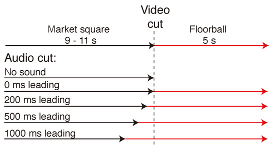 Structure of one trial. The Market square scene was visually displayed for 9, 10 or 11 s, after which the visual scene was cross-faded to the Floorball scene with a 10 ms cross-fade time. The sound scene was cross-faded similarly with a 10 ms cross-fade time with 4 different lead times in relation to the visual cross-fade. There was also a no sound condition where there was silence during the floorball segment. The task was to detect the ball in the game of floorball and press a button when the detection was confirmed.