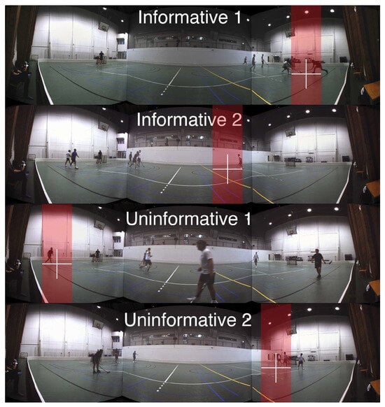 In each trial, the two scenes were always shown concurrently, the market square scene leading the floorball. The market square scene, chosen randomly from 6 segments with similar content, was shown visually either for 9 s, 10 s, or 11 s, after which there was a 10 ms cross-fade to the game scene, which was displayed for 5 s. Figure 3 displays a timeline of the progress of one trial with all possible asynchronies. The sound scene was cross-faded between the scenes at 4 different lead times in relation to the visual cut. There was also a no sound condition where there was silence during the floorball segment. The audio cross-fade occurred either at 1000 ms, 500 ms, 200 ms, or 0 ms before the visual scene cut. In addition, there were 4 different segments from the game of floorball with different characteristics. There were two segments where the sound scene helped in locating the ball that was bouncing on the floor (Informative 1 & 2), and two segments with no auditory information related to the location of the ball (Uninformative 1 & 2). The different segments are summarized in Table 1 along with the target eccentricities at the beginning of the floorball scene as seen from the viewpoint of the participant. Figure 4 shows the location of the ball and the distribution of players at the visual scene cut in each segment. In addition the areas of interest (AOI), which were used to count the time to first fixation on target, are marked in the Figure.