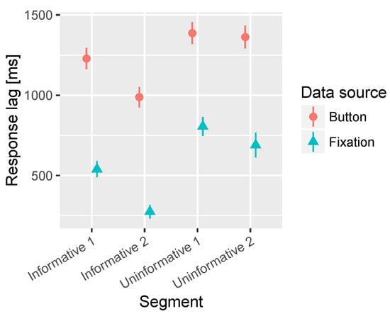 Combined mean times to first fixation on target and button press for the segments containing informative sounds and uninformative sounds. All audio lead times are collapsed together in this analysis. The bars represent the 95% confidence intervals of the mean.
