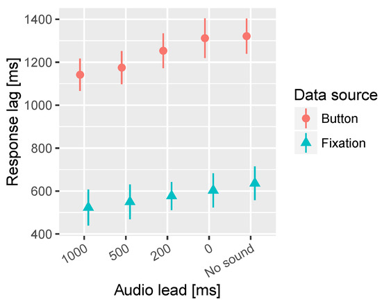 Combined mean times to first fixation on target and button press for the different audio lead times. All segments are collapsed together in this analysis. The bars represent the 95% confidence intervals of the mean.