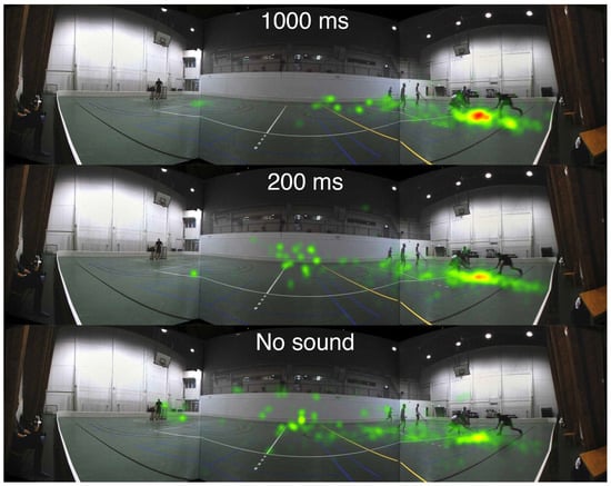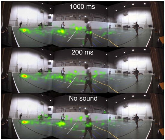 Inspecting Figure 8, a strong clustering of gaze in the 1000 ms condition is observed at the target location. The 200 ms condition shows less clustering and instead more fixations at the center of the screen. In the No sound condition the fixations are more spread out towards the center of the screen and to the opposite side of the court. By contrast, in Figure 9, with an uninformative soundscene, there are no noticeable differences in the heatmaps between the audio conditions.