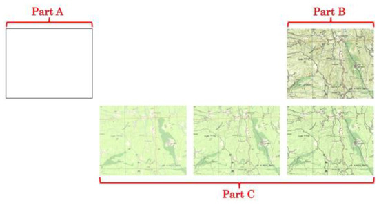 A blank (white, (R,G,B)=(255,255,255)) background is also used as experimental stimulus. The experimental process is executed into three parts depending on the used base map; Part A includes the blank background, Part B includes the original source map, and Part C includes the digitized map and the two base maps produced after the performance of intensity changes (Figure 2).