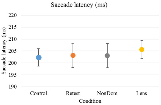 Mean (±standard deviation) saccade latency was 202 (±12) ms for the ‘Control’ condition, 203 (±17) ms for the ‘Retest’ condition, 203 (±17) ms for the ‘NonDom’ condition and 206 (±13) ms for the ‘Lens’ condition. Error bars represent the standard errors.