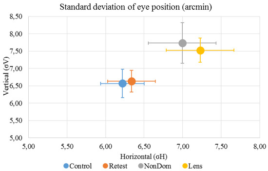 Mean (±standard deviation) horizontal standard deviation (σH ) was 6.22 (±1.04) arcmin for the ‘Control’ condition, 6.34 (±1.03) arcmin for the ‘Retest’ condition, 7.00 (±1.46) arcmin for the ‘NonDom’ condition and 7.23 (±1.46) arcmin for the ‘Lens’ condition. Mean (±standard deviation) vertical standard deviation (σV) was 6.57 (±1.40) arcmin for the ‘Control’ condition, 6.63 (±1.05) arcmin for the ‘Retest’ condition, 7.73 (±1.95) arcmin for the ‘NonDom’ condition and 7.53 (±1.17) arcmin for the ‘Lens’ condition. Error bars represent the standard errors.