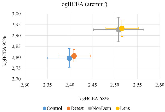 LogBCEA. Mean logBCEA and standard deviation for 68% and 95% of eye positions, measured in arcmin² were calculated for each subject and each condition (Figure 3).