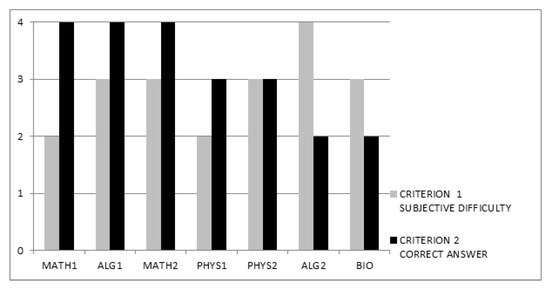 Tasks (MATH1, MATH2, ALG1) that were the most difficult according to the second criterion required the indication of two correct answers out of four. The moderately difficult tasks (PHYS1, PHYS2) were in the form of a single-choice question with 5 distractors. The easy tasks required indicating one answer out of two (ALG2) or four (BIO). Therefore, a distribution of the results obtained according to the second criterion (the answer correctness) reflects the task difficulty level that also results from the assumed number of distractors.