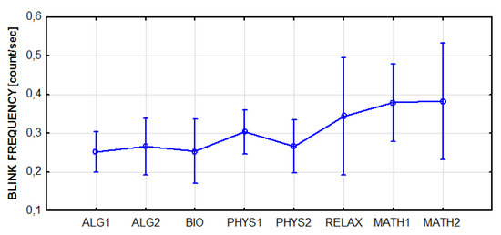 Blinks. In the blink parameter analysis, a stage of the experiment in which the subjects rested while listening to relaxing music was also included. In the case of the blink frequency (Blink Frequency [count/sec]), the analysis of variance showed that there were significant differences between the particular tasks [F(7,322)=2.114, p=0.042], and the HSD Tukey test (p=0.022) confirmed the significance of the difference between the first (ALG1 mean=0.24) and last (MATH2 mean=0.39) task. A tendency toward an increase in the blink frequency average in the subsequent tasks and its higher value during the relaxation in relation to the previous task can be seen in Figure 4. This regularity is probably a sign of visual apparatus tiredness, which progresses while the subsequent tasks are being solved. It was also observed in other research (Fukuda et al., 2005). The blink frequency increases in situations of a decrease or lack of visual stimuli was also confirmed in other investigations, and this fact was interpreted in the following way: it seems that you may blink more frequently because in this specific situation, it will not be connected with the loss (omission) of visual information (Nakano et al., 2009; Ledger, 2013).