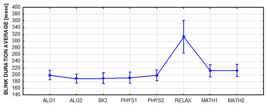 The average blink duration was a strong differentiator of the relax phase. The mean values of this parameter (Blink Duration Average [msec]) while solving tasks ranged from 188 msec (for task ALG2) to 212 msec (for task MATH2), but in the relax time they were found to be longer and lasted 313 msec on average. The variance analysis [F(7,322)=15.294, p<0.001] and Scheffe’s test (p<0.001) showed that there were significant differences between the relax phase and the stages of solving the particular tasks for that parameter. During proper solving of the tasks, the blink duration average was similar. Therefore, it was not a parameter dependent on the type of task. No differences between the distinguished groups were observed [F(1,46)=1.373, p=0.247]. The results obtained are presented in Figure 5.