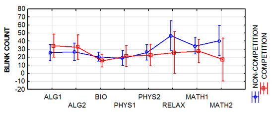 As presented in Table 5, the correlations of the fixation and blink parameters with the opinion of the all students about the task difficulty level (criterion 1) are rather weak, and they only turned out to be significant in some cases. However, three parameters displayed differences within the tested groups; they consisted in Blink count and their frequency as well as the frequency of fixation—within the Competition group the correlation for blink count factor is both significant and quite strong (r=0.49).