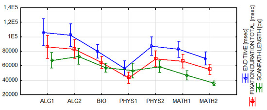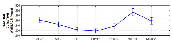 The highest value of this parameter can be observed in the case of the task MATH1 (mean=293.04 msec). This is the result in which the Scheffe’s test deviates and is statistically significant (p<0.001) from all other tasks. Undoubtedly, while solving this task the subjects showed the highest processing level of data registered by the eye (see Figure 7).