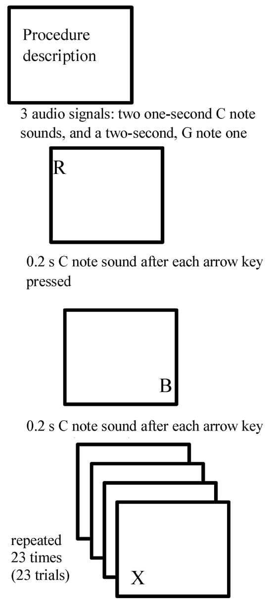 Stimuli. Because we were interested in finding the paradigm that led to the fastest possible reaction times learning process was facilitated by additional auditory stimulation (Davidson & Martin, 2013; Watanabe et al., 2016). At the beginning of the test procedure three audio signals were played. There was also an auditory notification after each key was pressed by the participant. Initially, a signal indicating the beginning of the session was used, consisting of notes C, C and G, played consecutively for one second, one second and two seconds, respectively. The higher pitch at the end of auditory stimulus emphasized the participant’s need to focus as the session was about to begin. Another auditory signal was used after each trial (participant’s keystroke response), (G note, 0.2 s) regardless of response accuracy (see Figure 2). The location of the stimuli on the screen differed; the consecutive single letters were presented randomly in one of the screen corners. Participants had no prior knowledge of the experiment and the possible letter location on the screen.