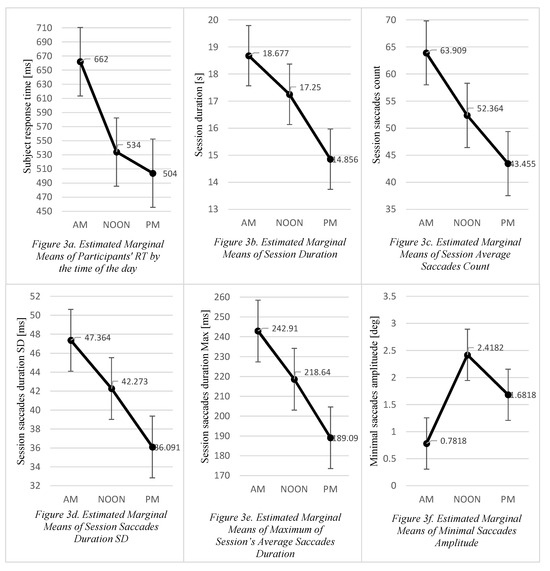 The changes in maximum saccade duration between the three sessions were also analysed. The differences in maximum saccade duration between the AM (M = 242.90, SD = 53.20), NOON (M = 218.64, SD = 55.76) and PM (M = 189.09, SD = 60.10) sessions were not statistically significant (F(2, 20) = 2.573, p < .101, η2 = 0.205) and the effect size was considered large. The contrast analysis confirmed the large effect size for the differences in maximum saccade duration between AM—PM (p < .082, η2 = 0.272) and NOON—PM (p < .087, η2 = 0.265) sessions and as seen in the chart (Figure 3e) the decreasing trend was noticeable.