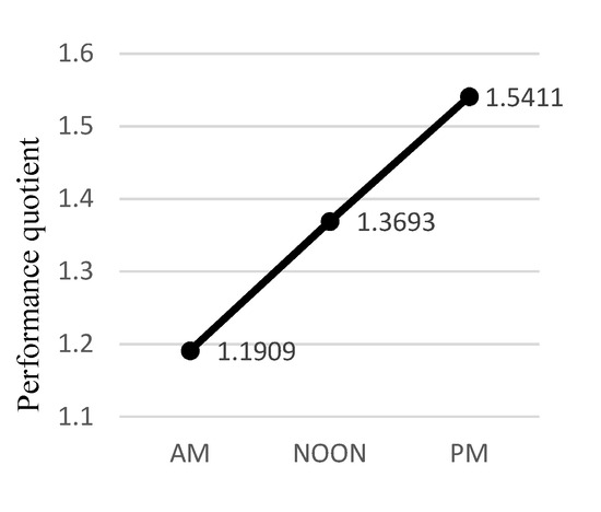 where ncorrect was the number of correct responses during a given session, ncorrect ϵ (0,23⟩, and t was the session DT expressed in seconds. The mean participant PQ differed significantly between sessions [F(2, 20) = 12.766, p < .001, η2 = 0.561]. The post hoc tests demonstrated statistical significance (p < .05) of differences in PQ between all sessions except for the NOON—PM one (p < .124). Accordingly, we conclude that there was a statistically significant performance improvement between the sessions, except for the NOON-PM difference (Figure 4).