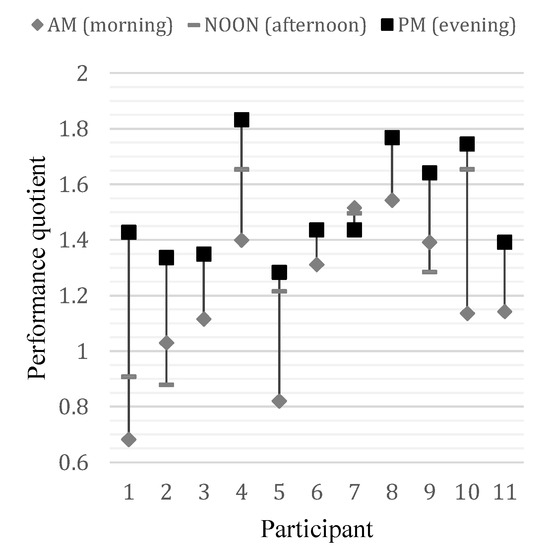 Performance quotient differences between sessions in every participant. PQ was the highest during the PM session in all but one participant.