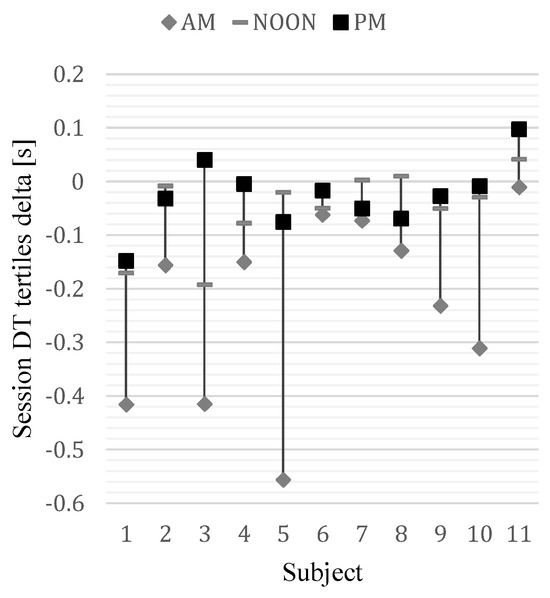 Session duration time (DT) was calculated as a sum of 23 trial RTs within a single session. The mean session DTs expressed in seconds differed significantly [F(2, 20) = 6.149, p < .008, η2 = 0.381] between the AM (M = 18.67, SD = 4.02), NOON (M = 17.25, SD = 4.24) and PM (M = 14.86, SD = 1.90) sessions and the effect size was considered high. The post hoc tests confirmed the statistical significance of the DT difference between the AM and PM sessions only (p < .005) (Figure 3b, Figure 5).