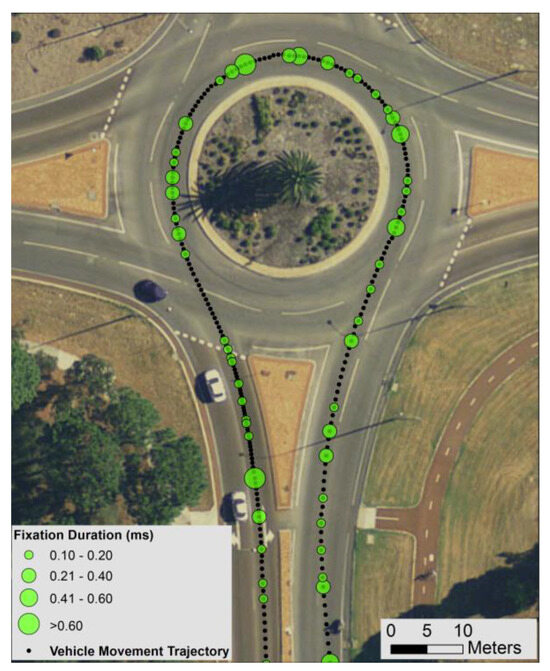 For visually exploratory inspection, Figure 9 illustrates a sample of spatial distribution of eye movement at a roundabout U-turn and straight road driving. The difference in visual search patterns is obvious, with the driver exhibiting larger fixation durations and larger variation of fixation durations (standard deviation of fixation duration), but less frequent fixations on the straight-driving, compared to the U-turn manoeuvre at the roundabout.