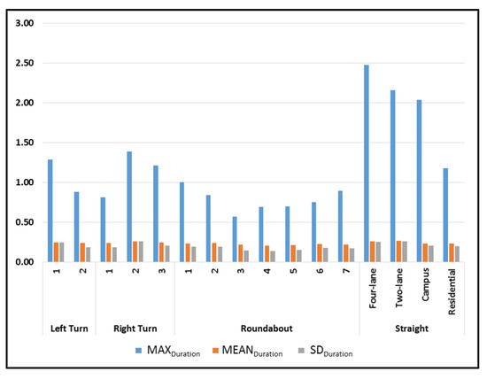 Figure 8 compared the statistics of the maximum, mean and standard deviation of fixation durations for the 16 driving sections. The maximum fixation durations (MaxDuration) of participants during straight road driving are significantly higher than both turns and roundabout performance. However, the mean (MeanDuration) and standard deviation of fixation durations (SDDuration) are similar with the slightly lower values observed for roundabout driving.