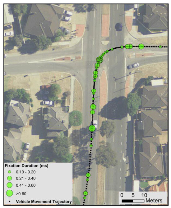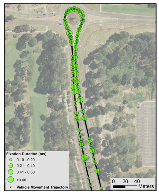 Visualizing and Spatial Statistics of Geo-coded Eye Movement. The eye fixation data and vehicle trajectory were synchronized using time stamp as the common link, so each fixation has a (x, y) coordinates assigned from the vehicle position, in order to represent “from where” the driver started gazing; and the fixation duration from the eye tacking analysis gives the period of the gazing. The geocoded eye fixations data was then overlaid with driving route in a GIS environment. Accurate spatial gazing pattern analysis can be conducted by statistically reporting eye fixations in various driving sections.