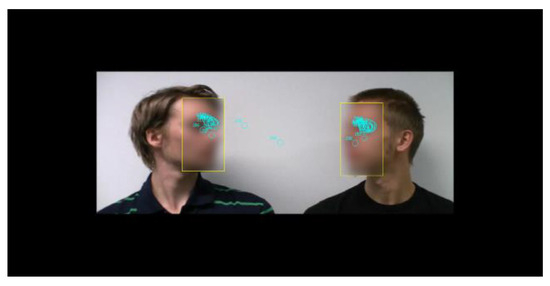 Figure 1 presents a screenshot from a stimulus video, overlaid with eye movements from a single trial. In total, 128 discussions were created, with each participant watching 64 videos in the experiment. The two actors were seated beside each other in front of a white wall. A high-definition (HD)-quality video recorder (Canon Legria HF200) was firmly fixed and zoomed so that only the discussants’ heads were visible. Each video consisted of the following phases: 2 s of silence, the first line spoken by one discussant, 2 s of silence, the second line spoken by the other discussant, followed by 5 s of silence. There were four male actors in each series. All combinations of actors with both speaking sequences were recorded, and a mirrored version of each clip was created. The videos were edited with video editing software (Adobe Premiere Pro CS5.5). In the experiment, the videos were played in HD format (resolution 1920 × 1080, 25 frames/s). The stimulus size corresponded horizontally to 32 visual degrees and vertically to 18 degrees (