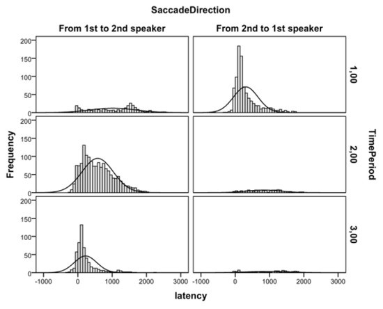Figure 2 shows the histograms of saccadic latencies of these attention shifts relative to the onset of the time periods. These data indicate that the attention shifts to the current speaker were closely aligned with the onsets of second spoken line, whereas the attention shifts from the current speaker were much more randomly scattered over time. Next, we report the results of the timeperiod locked analyses with mean values presented in