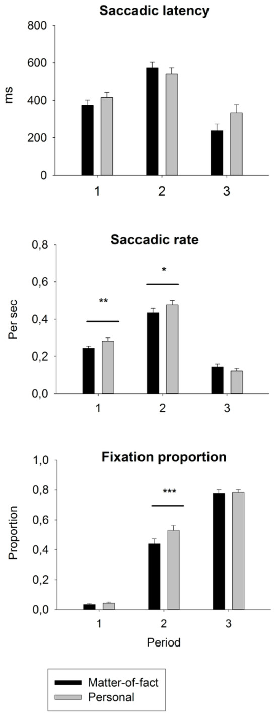 Conversation content. In the ANOVA for topic x period, a main effect of topic, F(1, 39) = 5.27, p = 0.027, ŋ2 = 0.119, resulted from the higher saccadic rate for personal (mean = 0.297) vs. matter-of-fact (mean = 0.277) conversations. The main effect of the period, F(2, 38) = 75.7, p < 0.001, ŋ2= 0.799, resulted from the higher saccadic rate during period 2 (0.465) vs. period 1 (0.263) or period 3 (0.134) (ps < 0.001). The result of the two-way interaction of topic x period, F(2, 38) = 6.05, p = 0.005, ŋ2 = 0.241, was significant in both planned contrasts between period 1 vs. 2 and period 2 vs. 3, F(1, 39) = 4.95, p = 0.032, ŋ2= 0.113. The saccadic rate was .040 higher in personal vs. matter-of-fact conversations during both periods 1, F(1, 40) = 7.27, p = 0.010, ŋ2= 0.543, and 2, F(1, 40) = 4.24, p = 0.046, ŋ2 = 0.096, whereas during period 3, this difference was not present (p > 0.050).