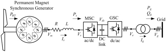 One of the two most employed strategies to integrate the power coming from a wind plant into the electric system is that of using a PMSG connected to the grid by means of two power electronic converters (as depicted in Figure 1) [15,16].