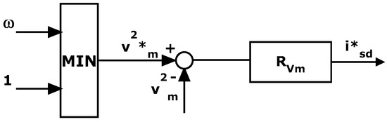 The voltage channel takes its reference signal from Equation (4) and typically implements a structure of the kind depicted in Figure 4, where the output of the machine voltage regulator RVm becomes the reference signal for the direct axis stator current regulator (the block MIN is the minimum selector representing Equation (4)).
