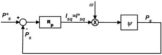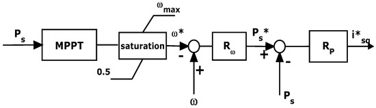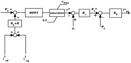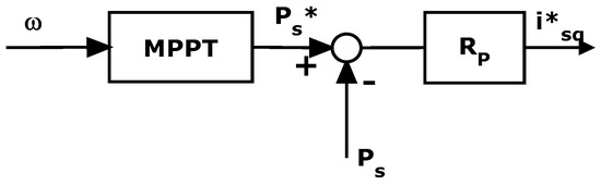 Equation (23) means that the power coming from the wind equals the active power available at the machine terminals plus the losses in the stator windings and in the cable connection. Both the control schemes appearing in Figure 5 and Figure 6 imply that Ps follows the MPPT curve; thus, assuming that the desired working point is in the range in which the MPPT curve is increasing (i.e., the pitch controller is not active), with the same notations used in Section 2, it is possible to write the following power balance: