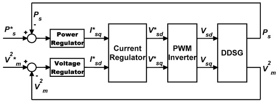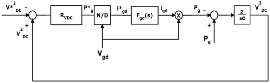 The DC link voltage vDC regulator synthesis can be done recalling Equation (25); in neglecting the active power losses, it is clear that for any change in wind speed, and therefore in the power Ps, it is possible to keep the DC link voltage constant acting on the power Pg. Completing the scheme of Figure 8 it is possible to achieve the control scheme of Figure 15.