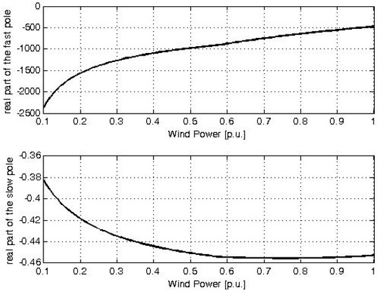 - The poles of the machine currents loop are −27 ±45j; while the poles of the active power and of the speed loops are respectively −1.6 and −0.017 ±0.05j. With these values, the dynamics of the three loops act on different time frames, thus meeting the requirements of Equations (31) and (34).