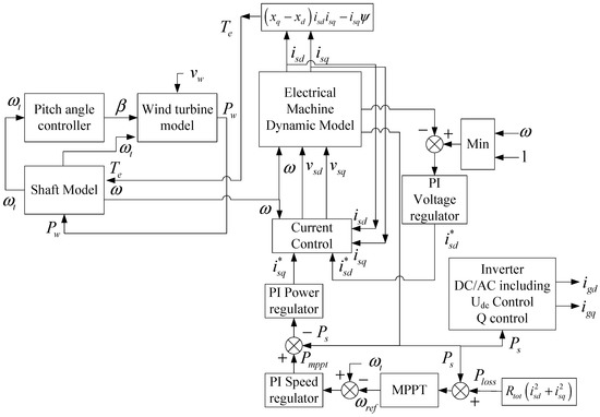 As outlined in [28], the controllers of both MSC and GSC normally have a nested-loop structure with a fast inner current loop, controlling the stator d- or q-axis currents, combined with outer slower loops that pursue the control aims described in the previous section (i.e., extracting the maximum power from the wind turbine and controlling the voltage at the machine terminals for the MSC controller and regulating the voltage on the DC link and the reactive power delivered to the main network for the GSC one). The aim of this section is to describe the overall wind generator architecture that accounts for the system power losses before detailing an effective regulator synthesis in Section 6.
