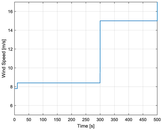 The model is initialized with a wind speed corresponding to an active power production equal to 0.55 p.u. (1.1 MW). Then, two consecutive wind speed variations are provided (Figure 17): the first one is triggered at 5 s and increases the wind speed up to 8.4 m/s, while the second one occurs at 300 s and brings the wind speed to 15 m/s, activating the pitch controller.