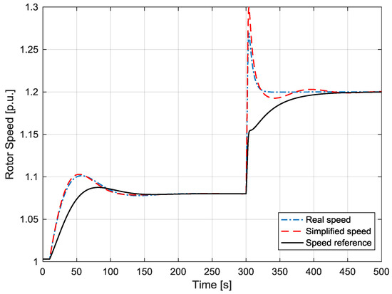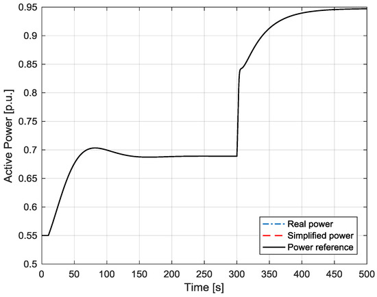 The first transient is characterized by a final steady state within the limits of the MPPT speed curve, while the second is associated with the activation of the speed limitation at 1.2 p.u. As one can notice, the simplified dynamics are very close to the real one in both conditions, stating that the control scheme of Figure 12 can be used to synthesize the speed regulator parameters. Figure 19 compares the dynamics of active power Ps considering the complete control scheme, blue line, the simplified one of Figure 11, red line, and the time evolution of the power reference signal as dictated by the speed controller, black line (the three curves are basically overlapping so that it is almost impossible to distinguish them). The fact that the blue line is coincident with the red one leads to the conclusion that the equivalent scheme of Figure 11 is a good approximation of the real model. Moreover, as it is not possible to distinguish between the power time profile and its reference signal in a timeframe of about 500 s, one can conclude that the active power loop dynamics are much faster than the speed one. This can be confirmed through examining Figure 18 where the speed dynamics are much slower. This is consistent with previous assumptions. The current waveform is not reproduced here since it is much faster than the power one.