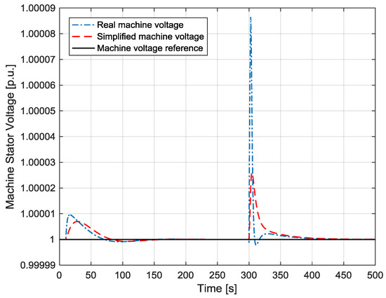 Another verification that has been performed is related to the machine voltage regulation loop, comparing the time profile obtained by the simplified linear scheme of Figure 13 with the actual machine voltage time profile obtained by the complete model. Figure 20 depicts the simplified and real machine voltage profile as well as the machine voltage reference provided to the controllers. As one can notice, the two profiles are slightly different but similar enough to provide a good approximation to apply the criteria for the regulator synthesis.