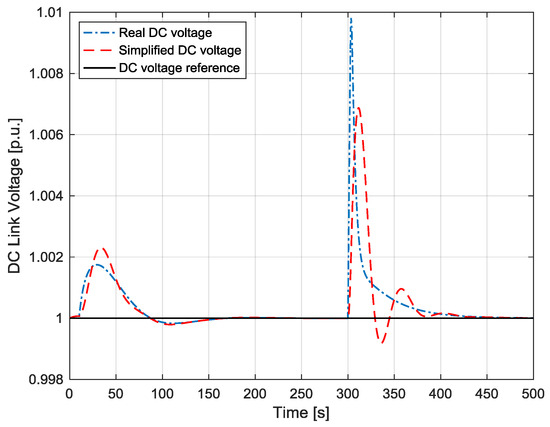 Finally, Figure 21 reports the dynamics of the DC link voltage obtained with the full model and with the simplified linear block scheme of Figure 12. Once again, there are some deviations between the simplified dynamic and the real one; nevertheless, the settling time and the overall behavior are acceptable for considering the simplified scheme as valuable in providing the criteria for the regulator synthesis.