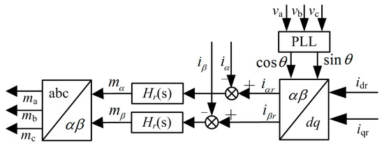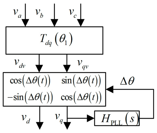 Figure 5 depicts the basic building block of a synchronous reference frame (SRF) PLL, where is the phase of the grid voltage, and HPLL(s) is the loop compensator. In order to solve the nonlinearity in Park’s transformation, we break Figure 5 into two parts as depicted in Figure 6, where .