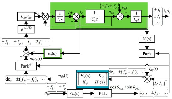 Under the dq-domain IC feedback control, this is equivalent to the L-filter inverter shown in Figure 2 [10], Cf and L2 are considered as parts of the grid impedance, so the only difference in the signal flow diagram between GC and IC feedback is the green area illustrated in Figure 4. Under the αβ-domain GC feedback control, the only difference of signal flow diagram between dq- and αβ-domain control lies in the blue area depicted in Figure 4. Similarly, their inverter output impedances are modeled as follows:
