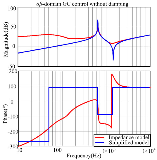 Referring to the high-frequency (>500 Hz) characteristics of the output impedance, Figure 11 shows the comparison of the whole impedance model and the simplified model as in (22). The simplified model just considers the filter part. It can be concluded that the simplified model can describe the high-frequency impedance characteristics well, which indicates that high-frequency characteristics mainly lie in the filter.
