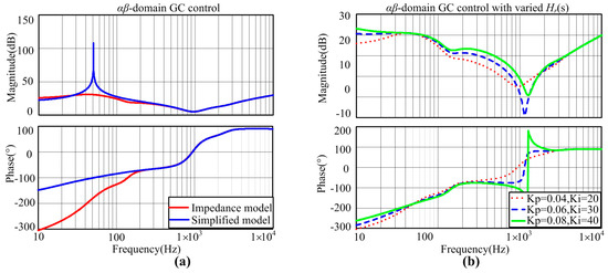 As for the medium-frequency (200–500 Hz) characteristics of the output impedance, Figure 12a shows the comparison of the whole impedance model as in (18) and the simplified model as in (23) derived from neglecting the PLL in (18). Figure 12b depicts the impedance response with different current controller parameters. It can be seen that the simplified model can represent the medium-frequency impedance characteristic well, and the adjustment of current controller parameters has a great influence on the medium-frequency impedance characteristics [1,6], which illustrates that the medium-frequency characteristics are not related with PLL and they are determined mainly by the current controller parameters. Increasing the proportional and integral coefficients can improve the magnitude of the medium-frequency impedance greatly. However it deteriorates the phase in high-frequency range.