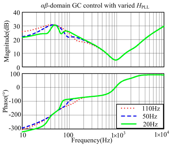 With regard to the low-frequency (30–200 Hz) characteristics of the output impedance, Figure 13 depicts the impedance response with different PLL controller parameters. It can be seen that the adjustment of PLL controller parameters has a great influence on the low-frequency impedance characteristics [1,10]. Considering the results of Figure 12b and Figure 13, it reveals that PLL contributes a lot to the low-frequency characteristics. Decreasing the bandwidth of the PLL controller can improve the phase of the low-frequency impedance.