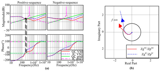 Impedance-based stability analysis results under different sampling currents when Lg = 5 mH. (a) Impedances of VSI and the grid; (b) Nyquist plot of impedance ratio.