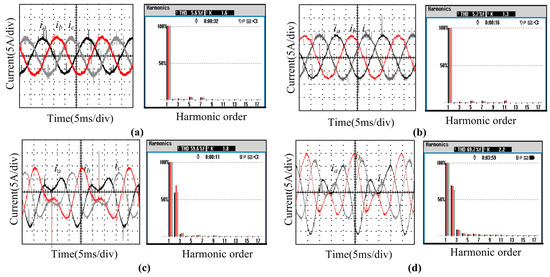 Grid-connected currents comparison under different current sampling schemes with varied grid impedance. (a) Grid-connected currents under IC sampling with Lg = 4 mH; (b) Grid-connected currents under GC sampling with Lg = 4 mH; (c) Grid-connected currents under IC sampling with Lg = 6 mH; (d) Grid-connected currents under GC sampling with Lg = 6 mH.