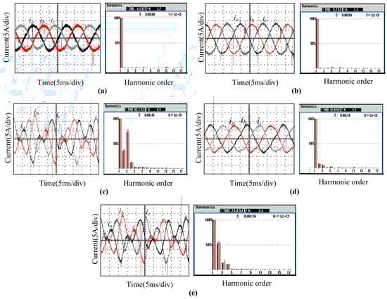 Grid-connected currents comparison under different current reference frame with varied grid impedance. (a) Grid-connected currents under dq-domain control with Lg = 2 mH; (b) Grid-connected currents under αβ-domain control with Lg = 2 mH; (c) Grid-connected currents under dq-domain control with Lg = 4 mH; (d) Grid-connected currents under αβ-domain control with Lg = 4 mH; (e) Grid-connected currents under αβ-domain control with Lg = 6 mH.