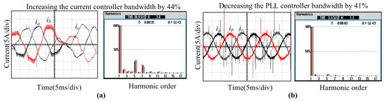Aiming at eliminating the resonance seen in Figure 19e, Figure 20 compares the effects of regulating the current controller and PLL controller. It can be concluded that decreasing the PLL controller bandwidth by 41% can eliminate the resonance absolutely and increasing the current controller bandwidth by 44% can only improve the resonance phenomena, so decreasing the PLL controller bandwidth is more effective to improve the stability in inverter-grid systems.