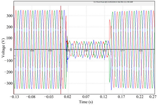 IEEE Standard 1159 and the European standard EN50160 give definitions for various PQ disturbances and the corresponding suggested threshold settings [24,25]. For instance, Figure 2 shows the disturbance defined as a sag in the mentioned standards, which occurred to a normal sinusoidal voltage during the time approximately from 0.02 s to 0.14 s. The disturbance signal was captured on 21 March 2014 in Jurong East which located in the West Region of Singapore. The official source said it was due to a customer installation fault at Jurong Gateway Road. The PQ will be considered poor if the voltage magnitude is lower than the threshold set by the standard. In this specific case, the threshold should be 90% of the normal voltage magnitude.