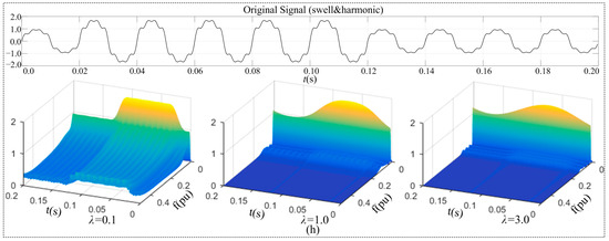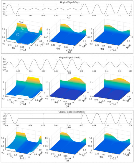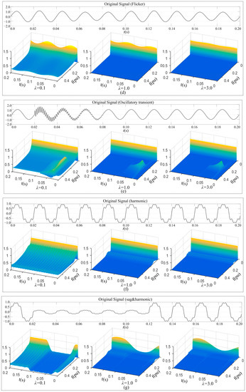 Figure 5a–h shows the 3D plots of the STA-matrix of eight disturbance signals, listed in Table 1. For each disturbance signal, there are three 3D plots, which are graphical presentation of the STA-matrix obtained with three different values of the width factor λ, respectively. The STA-matrix is obtained per Equations (6) and (7); three values of λ are 0.1, 1.0, and 3.0. The values of λ, 0.1, 1.0, and 3.0 are selected per what was presented in Section 2.3.1: One less than 1.0, 0.1, which is used to examine its impacts on the low frequency domain resolution; one greater than 1.0, 3.0, which is used to examine its impacts on the high frequency domain resolution, and the value of 1.0, which is used as the base for comparison purpose.