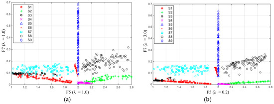 Comparison of F5 and F7 distribution behavior: (a) λF5 = 1.0, λF7 = 1.0; and (b) λF5 = 0.2, λF7 = 3.0.